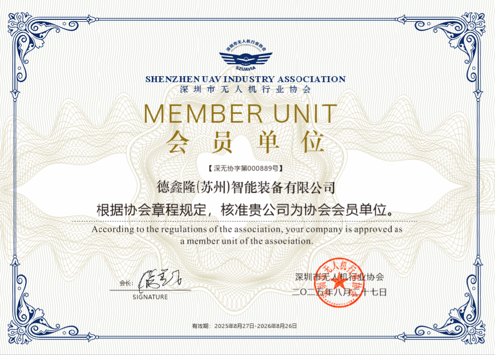 德鑫隆(蘇州)智能裝備有限公司榮任深圳市無人機行業協會會員單位